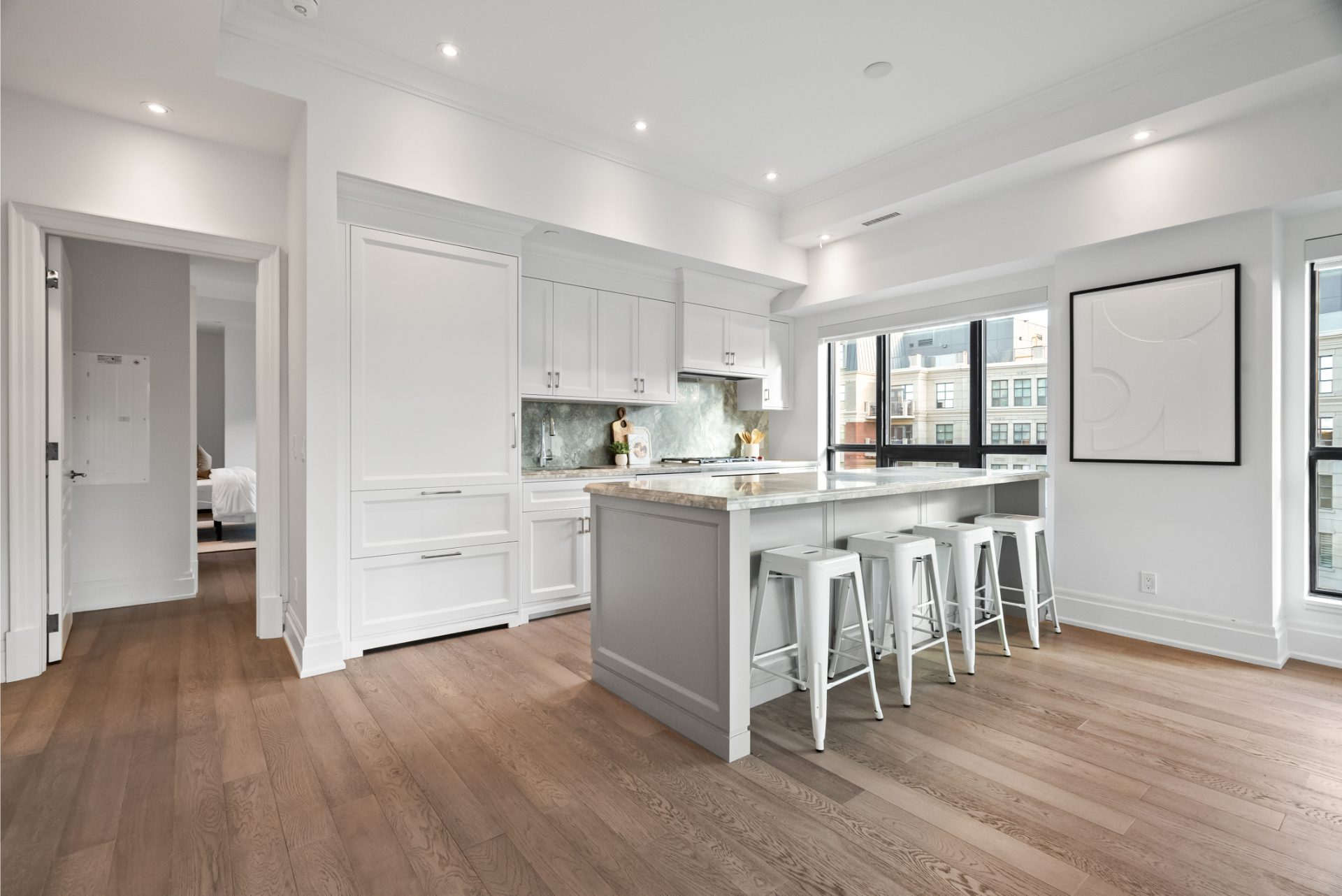 A stunning new kitchen is the heart of the home, complete with Quartz counters, breakfast bar, Sub-Zero, Wolf, and Miele appliances, plus a clever built-in pot filler in the dog nook