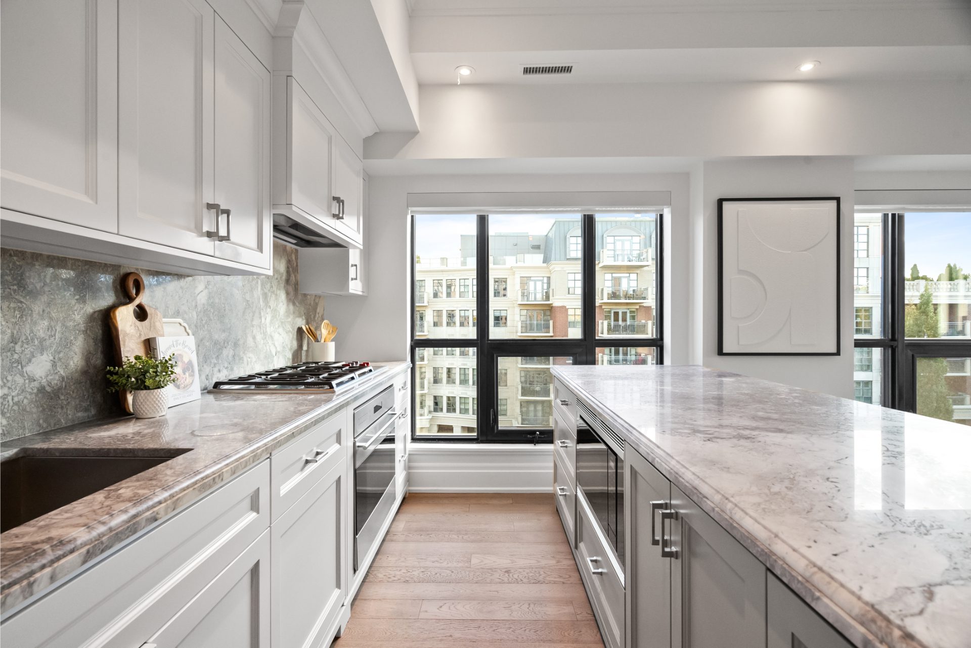 The chef’s kitchen boasts a large centre island, Quartz countertops, top of the line appliances, and abundant storage