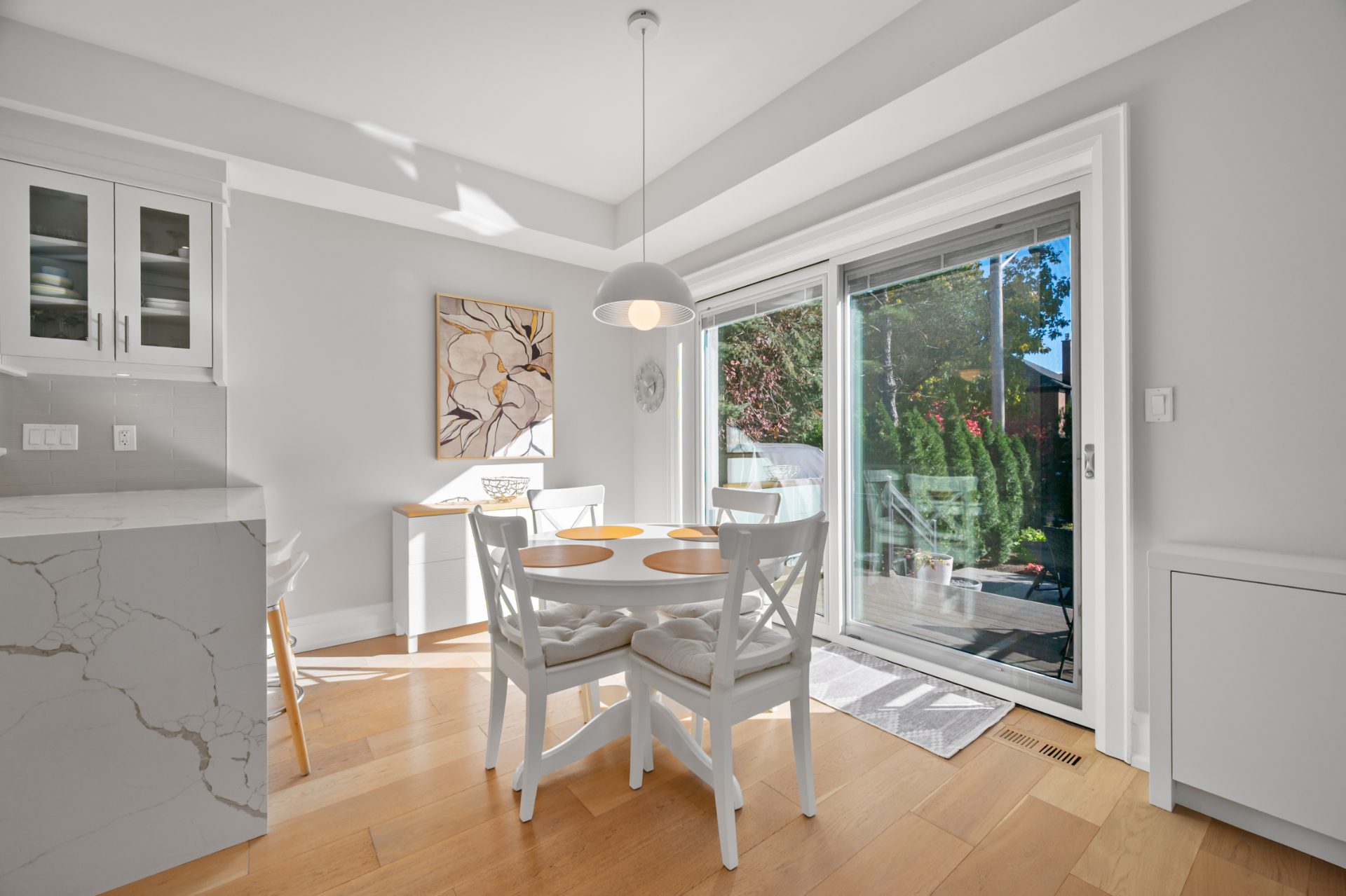 The show stopping kitchen features Quartz counters, a breakfast bar, and top-of-the-line Miele appliances, including a built-in coffee machine and seamlessly connects to the dining area with walkout to a private, professionally landscaped backyard