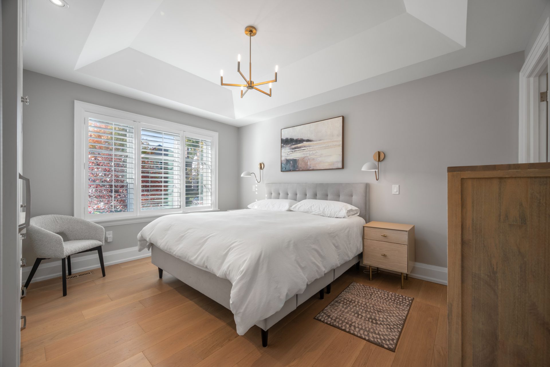 The designer primary retreat was recently redone, showcasing a vaulted ceiling, stunning custom built-ins, and a spa like 3pc ensuite with heated floors